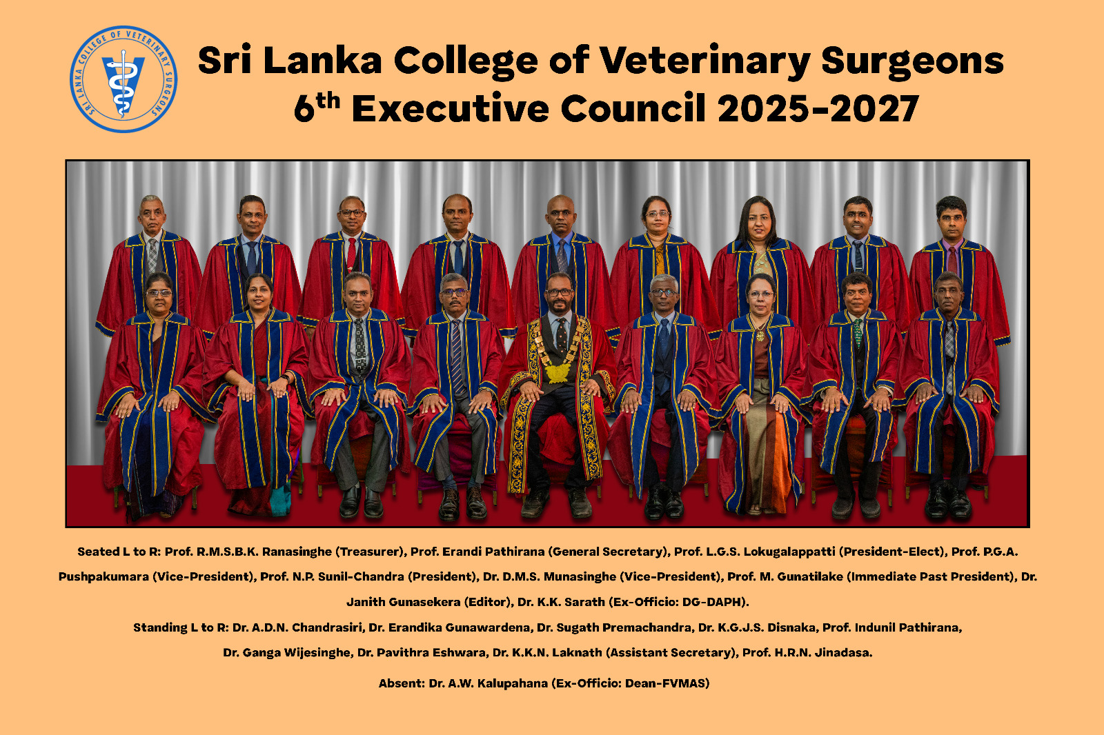 Prof. R.M.S.B.K. Ranasinghe (Treasurer), Prof. E. Pathirana (General Secretary), Prof. L. G. S. Lokugalappatti (President-Elect), Prof. P.G.A. Pushpakumara (Vice President), Prof. N.P. Sunil-Chandra (President), Dr. D. M. S. Munasinghe (Vice President), Prof. M. Gunatilake (Immediate Past President), Dr. J.K. Gunasekera (Editor), Dr. K.K. Sarath (Director General/DAPH)